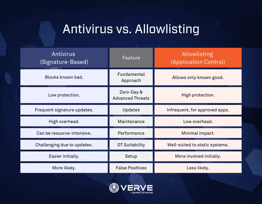 As explained by Verve Industrial Protection, “Allowlisting is a proactive cybersecurity strategy that blocks unauthorized programs from running by allowing only pre-approved applications to execute. It operates on a ‘default deny’ principle, meaning anything not explicitly permitted is automatically restricted.” (Verve Industrial)