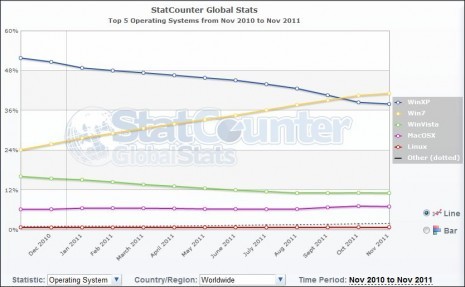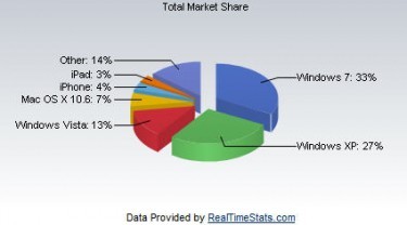 NetMarket still shows Windows XP in the lead with a 49% global share and Windows7 with a 35% share. Their stats for the US however tell a different story. Windows7 is ahead with a strong 6% lead or 33% to 27% market share.