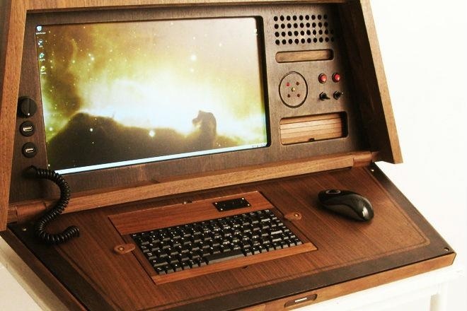 This unique wooden case uses modern components, including an embedded monitor and keyboard, to emulate the look and feel classic mid-century consumer electronics. The custom case folds up into a locked cabinet, making it look more like some family heirloom than a computer. Creator “quizz_kid” spent months designing and woodworking, and when he was done, he made his own custom “Sputnik” brand labels and retro-futuristic advertising for the project.