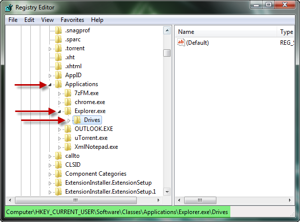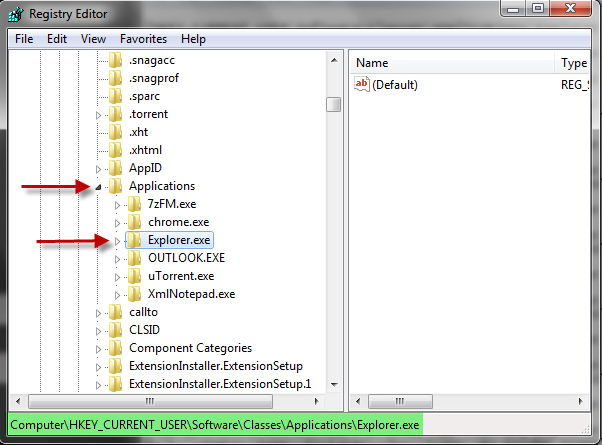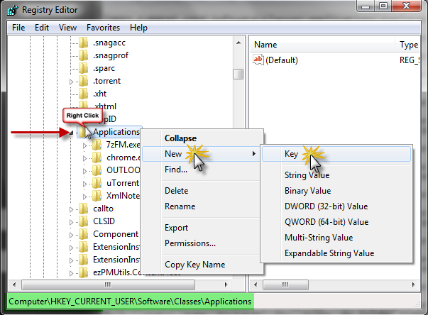 In the left hand pane, navigate to HKCU\Software\Classes\Applications , expand Applications and look for Explorer.exe. (See figure 1.). If Explorer.exe doesn’t exist, create it by right clicking on Applications and selecting New > Key. (See figure 2.)