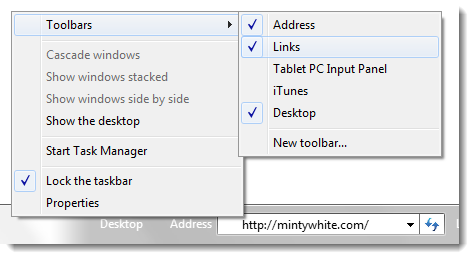 To enable the Desktop, Address, or Links toolbars on the Windows Taskbar, right click a blank space on the Taskbar and click Toolbars > Desktop (or Address or Links)