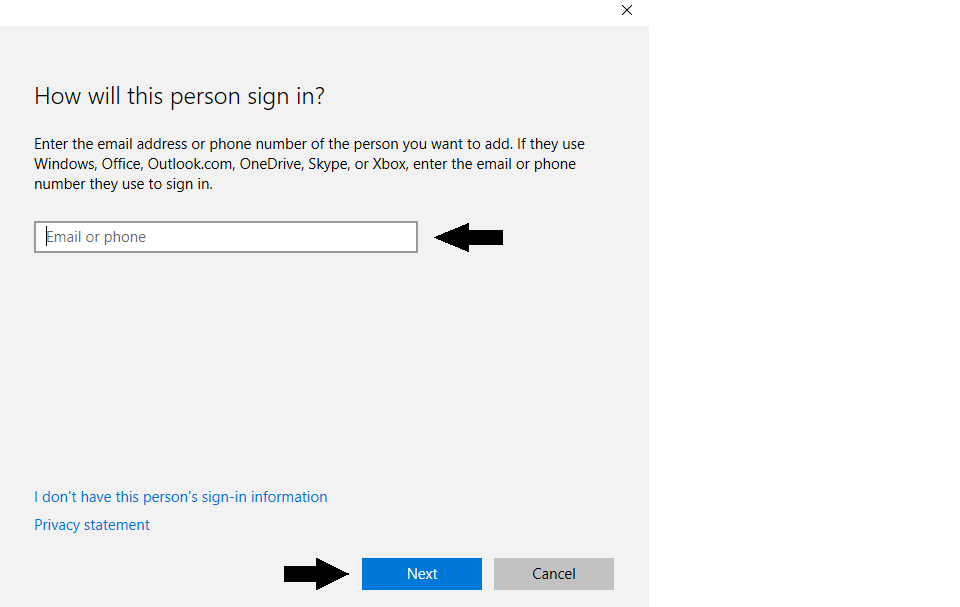 Click on “Add someone else to this PC”. This will bring you to this screen: