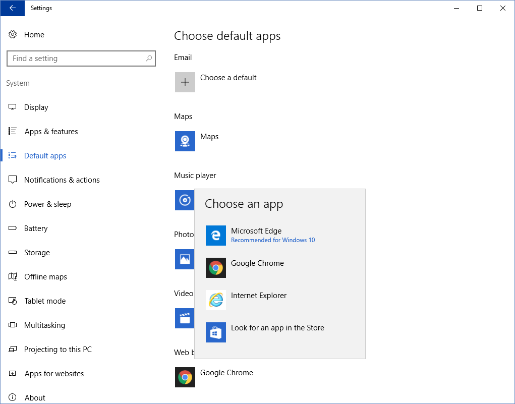 This will populate the screen below. It is here that you can adjust your default programming options. To do so, click on the app you would like to change. This will populate the different options, as shown below. Click on the option you’d like to adjust default app to, and you’re done.