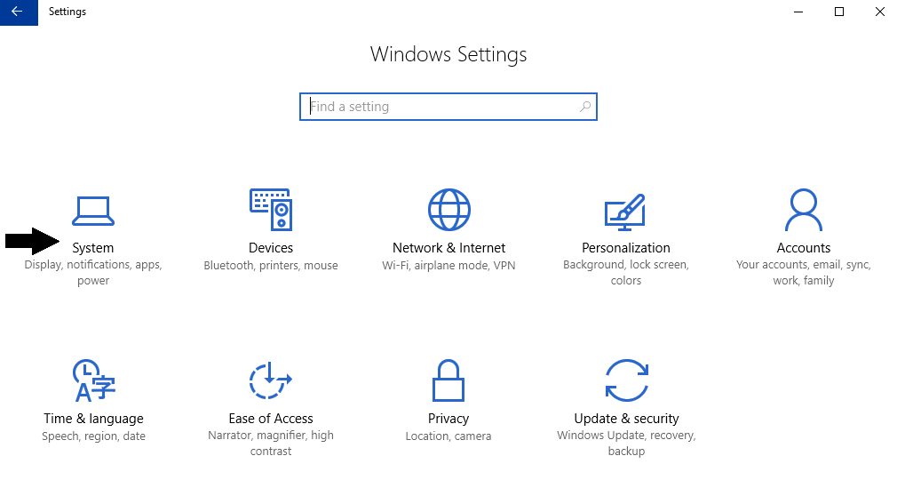 First, you will need to access your Settings. You can do so by searching for “Settings” in the search bar, or clicking on the Start menu and accessing it via your programs. Once you access the settings, you will click on “System” as shown below.