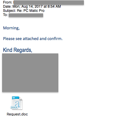 To begin this week, two of our PC Matic team members were targeted by a malicious email attachment from a contact they recently met. Both employees recognized right away something fishy with the email and believed it to be something malicious. All members of our team have taken part in the KnowBe4 cyber security training in the past, and it showed here. We’ll give you the details of the email to hopefully help you avoid similar emails in the future, even if they come from someone you know. After analyzing this threat, PC Matic would have stopped it at execution, but avoiding falling into these infection traps all together is always a good practice to maintain.