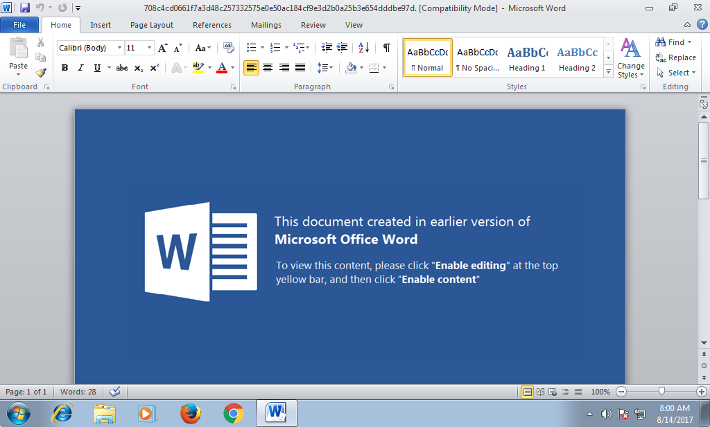 If you were still not skeptical of this email after it was sent to you, opening the Word Document leads to a request for macros to be enabled. You should never enable macros on a random document that was sent to you as these macros will often access malware on the web and pull it down onto your computer. Here’s a sample of the screen you would see if you opened the document.