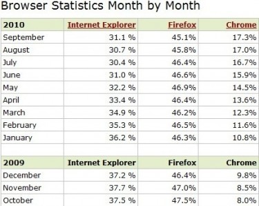 Today Chrome is still gaining rapidly but some think that Internet Explorer may be back in the race with the introduction of Internet Explorer 9. Although the boost for IE is more a matter of conjecture than actual fact, at least some watchers are reporting gains for IE.