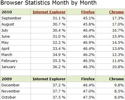 The next quarter is going to be interesting. Christmas will see the introduction of many iPad like devices hitting the streets. iPad is the fastest selling electronics device ever. How will the growth of tablets and mobile devices effect the browser wars? I’ll let you know at the begining of 2011.