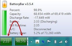 First of all, Windows built-in app does not provide us with advanced statistics and options about the laptop battery. We will need to use a third party app to monitor and see the stats of the battery. I am using BatteryBar free on my Windows 7 and Windows 8 computers. The basic version of BatteryBar will let you see advanced statistics about your laptop battery in real time like the total capacity of the battery in mWh, charge rate if the laptop is being charged, full run time and battery wear.