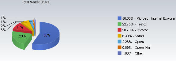 This means Microsoft has lost about 1/3 of their share in the last 7 years. During this time, first FireFox and more recently Google Chrome have seen their share increase dramatically. Right now Chrome is just short of 11% share and is the fastest growing of the browsers.