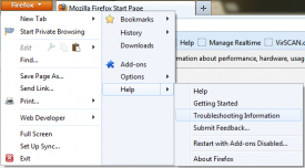 1.) Open FireFox at the top left of the program window and click the FireFox button and then go to the Help Menu. Next click Troubleshooting and then click Reset FireFox. Click the confirmation window and you’re done.