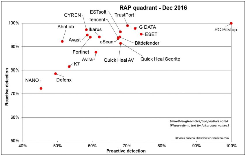 A third party testing agency, Virus Bulletin, provides a free Reactive and Proactive (RAP) test that several security companies participate in. The most recent results from their December 2016 testing can be seen below. You may also read the full report here.