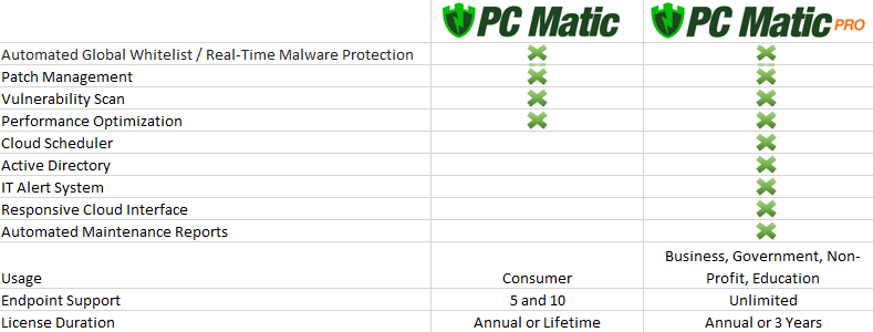 Often times, we get questions from potential consumers asking which security solution would best meet their needs, PC Matic or PC Matic Pro. To address this, we created the table below which provides the different features in each solution. Additional information regarding each feature is included below.