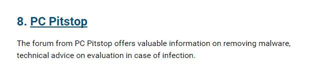 Security company Heimdal recently cited PC Pitstop in a list of the top 32 Go-To Security Forums for Free Malware Removal Help.