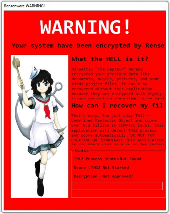 Ransomware, the malicious software that locks your files and demand a payment to retrieve them, was recently taken to a different level. A new ransomware variant, deemed Rensenware, locks your files and demands the victims play a game, Touhou Seirensen. Victims have to earn 200 million points on the Lunatic difficulty level, in order to retrieve their files.