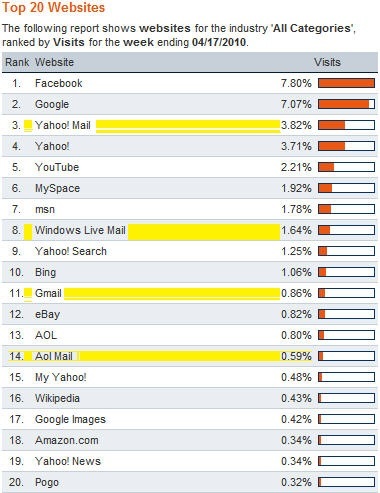 Gmail, Yahoo Mail, Windows Live Mail and AOL Mail are there, but the number of hits shown for a website is a far stretch to the number of people using that software as their primary email client.