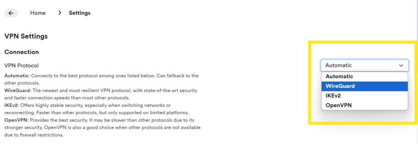 Change the VPN Protocol to “Wireguard” and try connecting again. If that fails, try the other options like “IKEv2” or “OpenVPN.”