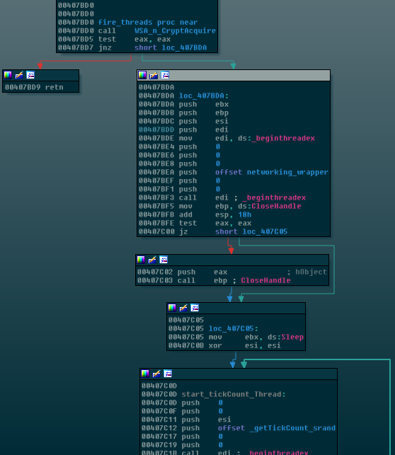 After the service is properly setup on the machine, StartServiceCtrlDispatcherA is run and passed into it is a serviceStartTable struct which contains as a member, the start address of the beginning of the payload function which I’ve named “register_service” which in turn launches the worm/network component of the malware as well as the EquationGroup SMB exploit. The beginning of this module can be seen in the following figure: