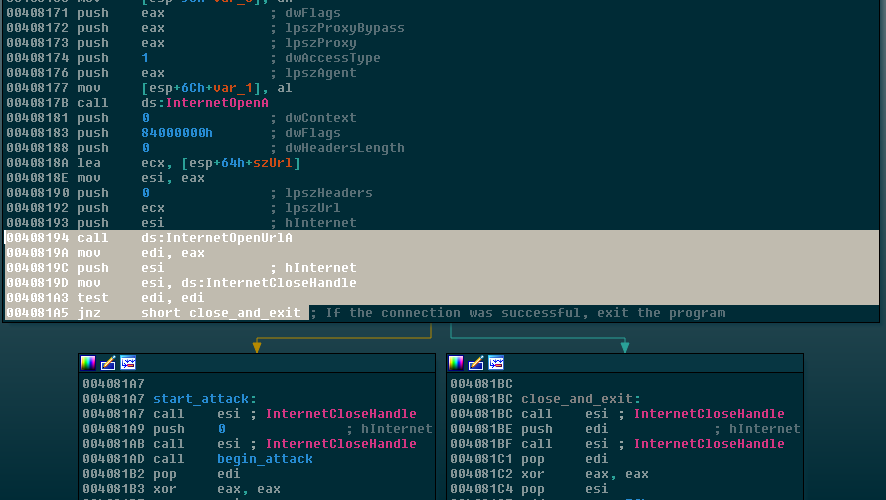 WanaCrypt0r first attempts to connect to this URL and proceeds only if the connection fails. This can be seen in the following disassembly’s highlighted area: