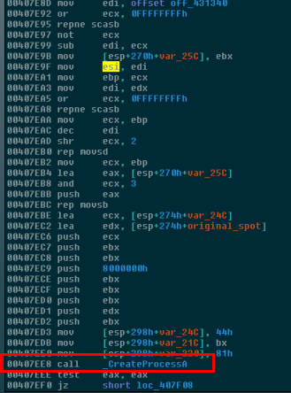 Finally, WanaCrypt0r launches the resource, which has now been dropped to an executable file, by calling CreateProcessA on it as shown here in red: