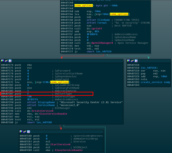 The reason that it does this is because by checking for the arguments, it can know whether this is first launch on the machine or not. If the arguments are not found, WanaCrypt0r will create a new service out of itself and this service will start it with the two arguments applied. This means that after the service is created because the ransomware has been run before on the machine, it will skip the service creation step and then just attempt to start the service. It starts a service called mssecvc2.0, which allows it to load into memory and start whenever the computer boots up. The first time around, the malware chooses the left path and executes a function that I’ve named “create_serv_Wrap”, which first creates a new service of itself, then drops the executable resource that we examined above onto disk, finally running it as well. We will see exactly how this happens after this figure, but first take a look at how the malware sets itself to auto-start on bootup by setting the dwStartType parameter of CreateServiceA to 2 which is of course Auto Start: a popular choice for malware as one may imagine: