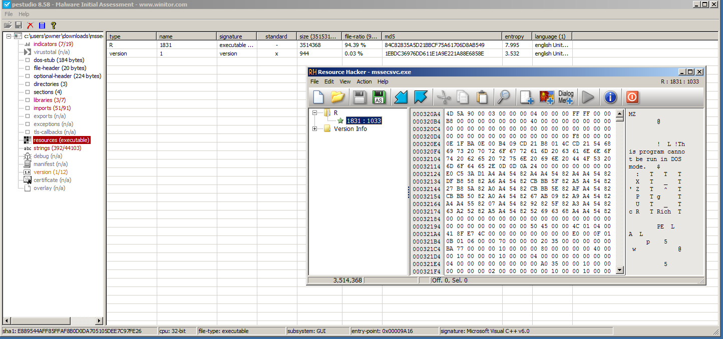 As we see above, even though the resource is in fact encrypted, it is still recognizable visually and by the system as a proper Portable Executable file due to the first two bytes of “MZ” (4D 5A) as well as the appearance of bytes “50 45” (PE) later in the file.