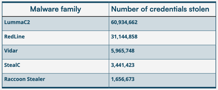 The report identifies Lumma and RedLine as the most active malware families harvesting these credentials in 2025. These stealers run quietly in the background, scraping saved login data from browsers and system files.